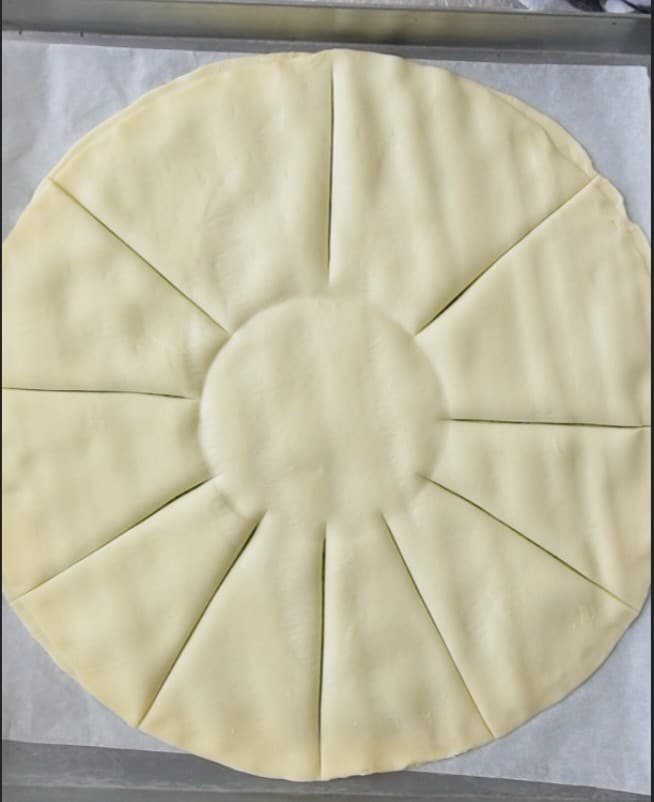 Com a ajuda de uma xícara, desenhe um círculo central e da circunferência deste último comece a fazer as incisões com um cortador de pizza ou com uma faca de lâmina lisa.