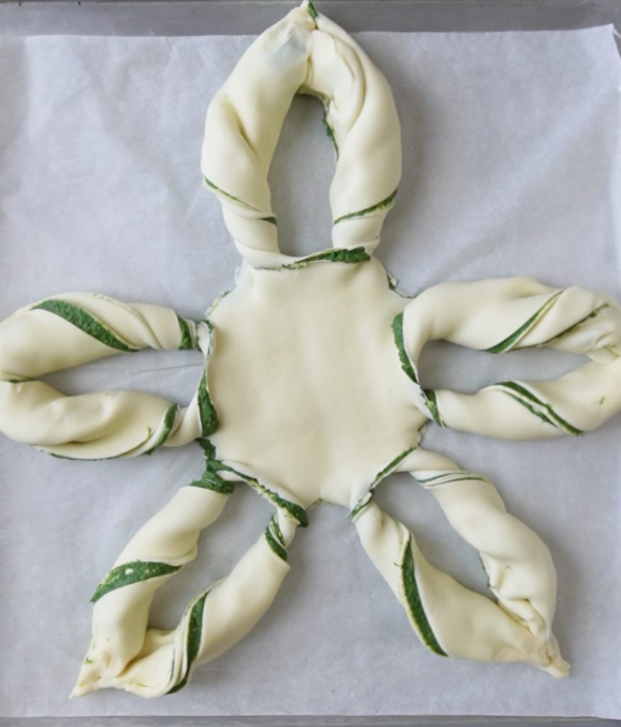 Uma vez criada a estrela, pincele com uma gema batida junto com uma gota de leite, tomando cuidado para não passar o pincel sobre o creme de espinafre.
