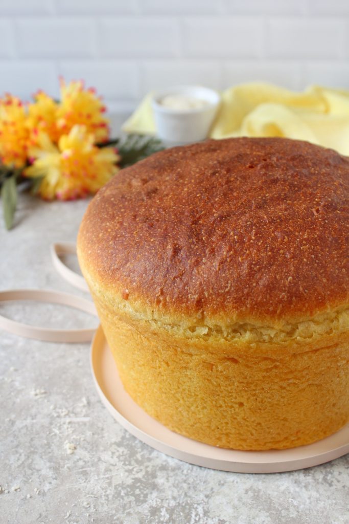 Terminada esta primeira fermentação, despeje a massa sobre a superfície, esmague-a delicadamente com as mãos, dobre-a ‘como um envelope’ (VEJA O VÍDEO CLICANDO AQUI) e coloque-a na forma de alumínio amanteigada e enfarinhada, tentando formar uma bola homogênea.