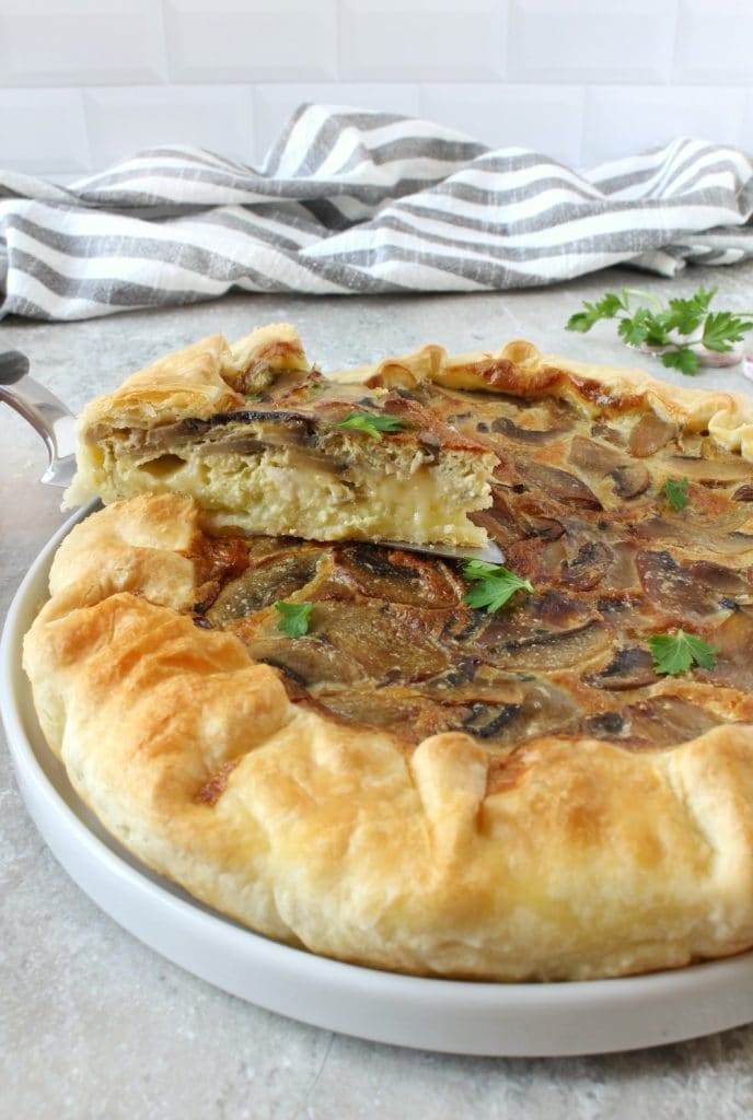 Se não for necessário que esta torta salgada seja vegetariana, você pode adicionar speck cortado em pequenos pedaços ao composto de ovos e cogumelos.