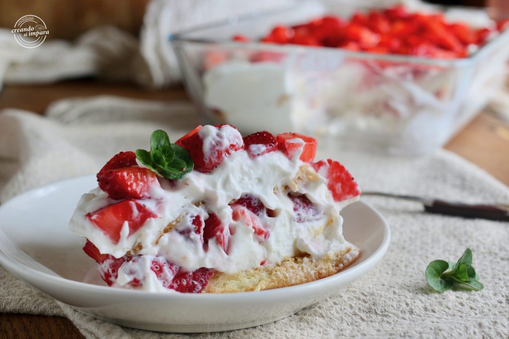 Em uma travessa, alterne os pavesini molhados com o suco de morangos, o creme de ricota e os morangos em pedaços. Faça várias camadas e coloque na geladeira por 2-3 horas antes de servir.