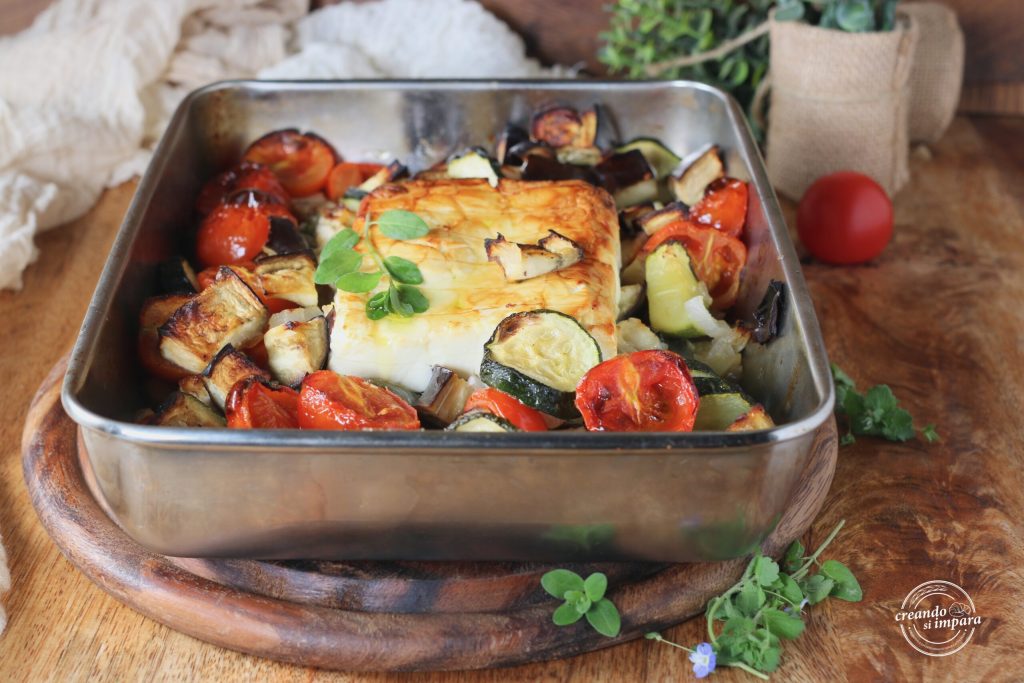 Feta assada com legumes, um prato saboroso, leve e fácil de preparar. Você pode usar os legumes que mais gosta: abobrinhas, batatas, cenouras, repolho, pimentões. Eu usei abobrinhas, berinjelas e tomatinhos, enriquecidos com cebola roxa, minha favorita. Com uma boa fatia de pão, talvez caseiro, torrado, esses legumes se tornam um prato único nutritivo. Até a feta pode ser substituída pelo queijo que você mais gosta. Algumas lascas de parmesão também ficam ótimas. Resta-nos trabalhar e preparar juntos a feta com legumes assados.