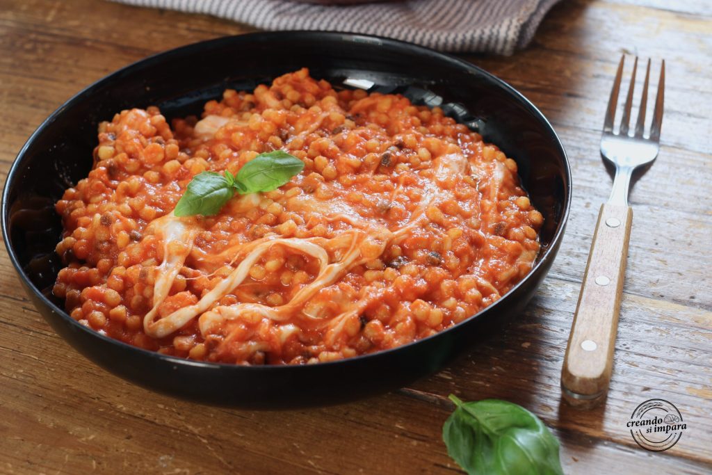 Vocês já sabem que eu adoro a fregula, uma massa da Sardenha, com um sabor espetacular. Desta vez, tentei fazer ela em estilo risoto alla pizzaiola com muita mussarela derretida. Foi um sucesso. Sumiu rapidinho. Cremosa e super derretida, perfumada com manjericão fresco e fácil de fazer. O que mais pedir? Obviamente você pode usar o queijo que desejar. Agora só nos resta começar a preparar a Fregula alla pizzaiola.