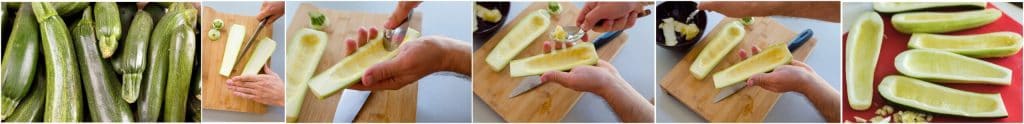 Começamos escaldando as abobrinhas em água ligeiramente salgada. Cortamos ao meio longitudinalmente ou transversalmente, dependendo se as abobrinhas são longas ou redondas. Retiramos a polpa que iremos picar e reservar