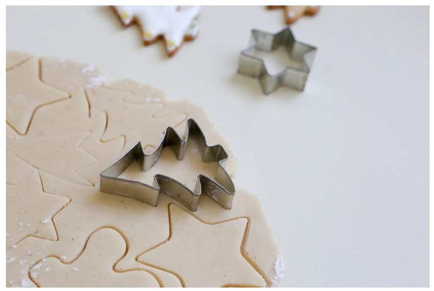 Aqui você pode encontrar a receita da massa frola para biscoitos. Estenda a massa em uma superfície de trabalho, enfarinhada a uma espessura de 4/5 mm. Em seguida, corte as forminhas e disponha os formatos do mesmo tamanho na mesma assadeira, forrada com papel manteiga. Se desejar, agora você pode fazer os furos no topo do biscoito para poder pendurá-los na árvore.