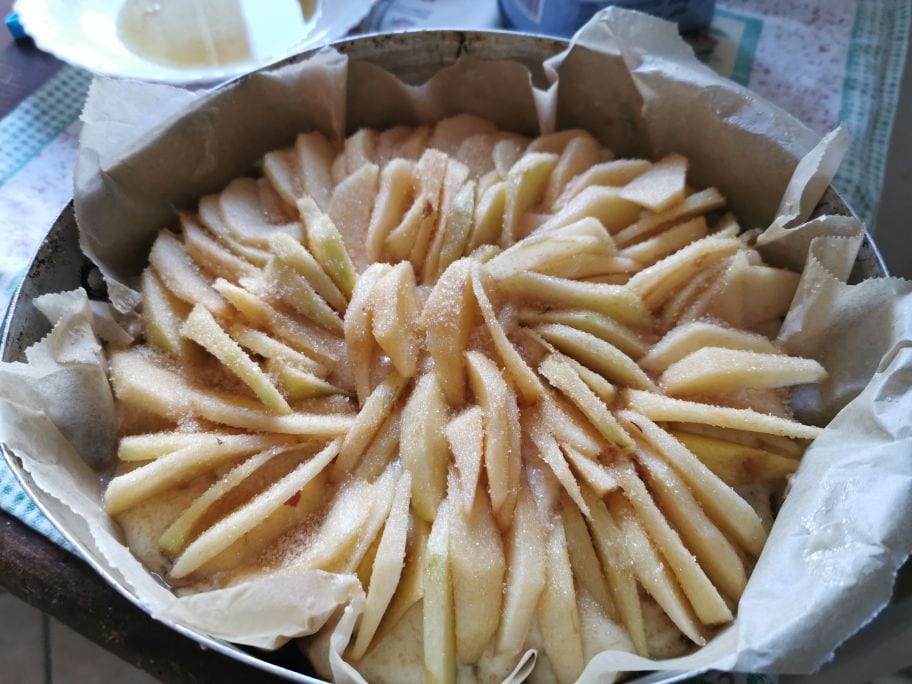 Agora despeje a outra parte da massa, nivele, e disponha as fatias restantes de maçã em forma de leque, polvilhe com açúcar e leve ao forno por 50 minutos a 180°. Verifique o cozimento com um palito, uma vez pronto, retire do forno e deixe esfriar.