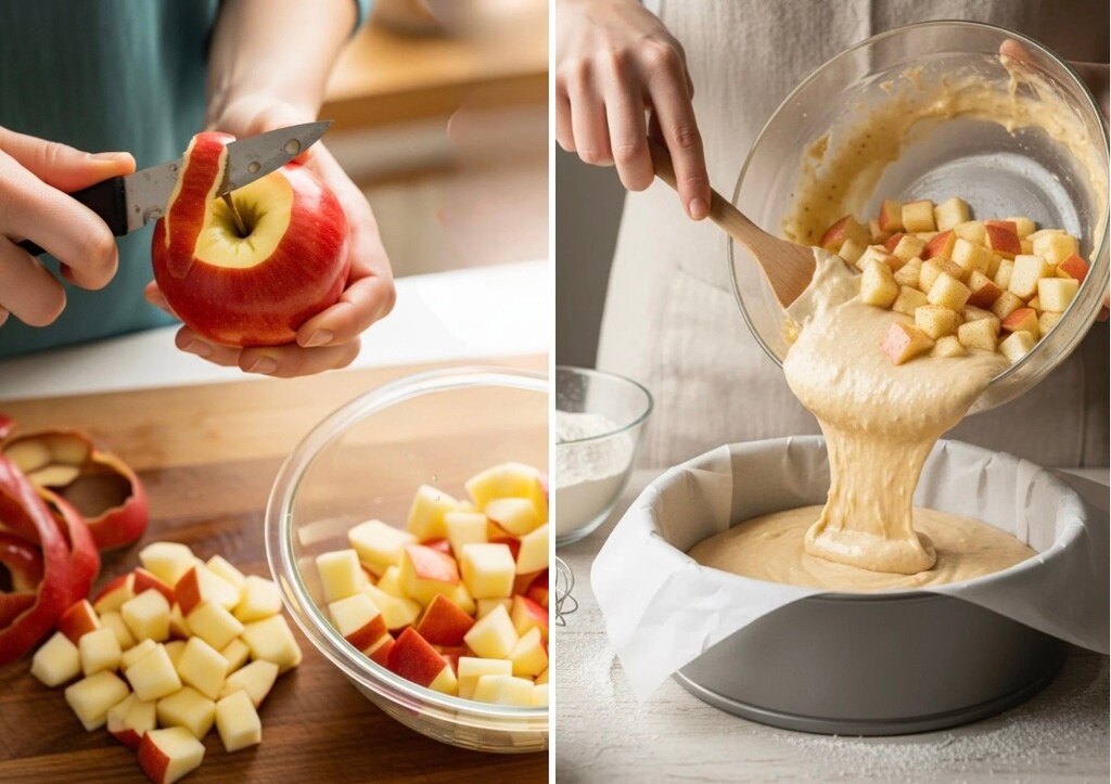 2. Misture Líquidos e Sólidos: À parte, em outra tigela, bata os ovos com a manteiga derretida (ou o óleo de coco) até obter uma mistura homogênea e ligeiramente espumosa. Despeje gradualmente os ingredientes líquidos na tigela com os ingredientes secos, misturando delicadamente com uma espátula ou colher de pau. Continue misturando até que a massa esteja lisa e sem grumos, mas tome cuidado para não trabalhar demais.As Maçãs Protagonistas: Descasque as maçãs, retire o miolo e corte em cubos de cerca de 1 cm. Transfira os cubos para uma tigelinha e regue-os imediatamente com o suco de limão para evitar que escureçam e para adicionar um toque de frescor. Adicione um generoso pitada de canela em pó e misture bem. Incorpore suavemente as maçãs à massa principal, distribuindo-as uniformemente.