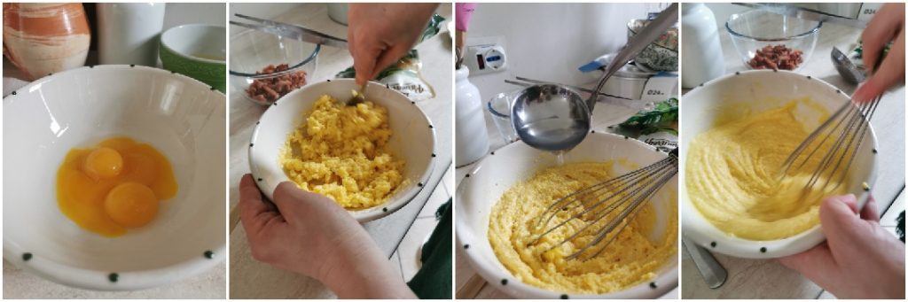 Em uma tigela, bata as gemas com o pecorino romano ralado, o parmesão, e uma pitada de pimenta, acrescente o ovo inteiro, misture com um batedor de mão. Para um molho ainda mais cremoso, adicione um pouco de água do cozimento da massa à mistura de gemas e queijo