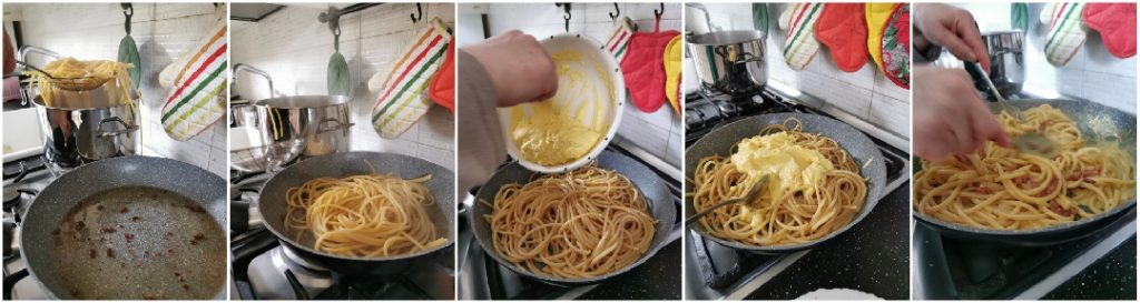 Escorra os bucatini al dente e transfira-os para a frigideira onde foi cozido o guanciale. Com o fogo desligado, despeje a mistura de gemas e queijo na frigideira e misture energicamente para amalgamar tudo. No final, adicione o guanciale, misture, e sirva imediatamente. Você pode adicionar mais pecorino ralado se quiser