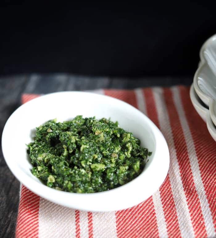 Dez minutos antes do final do cozimento, preparamos um molho: picamos a salsinha com o alecrim, picamos os miolos de nozes, e ralamos as raspas do limão. Juntamos todos os ingredientes em uma tigela pequena, adicionamos um pouco de azeite, e ajustamos o sal e a pimenta. Servimos o coelho em um prato e acompanhamos com o molho e fatias de polenta grelhada.
