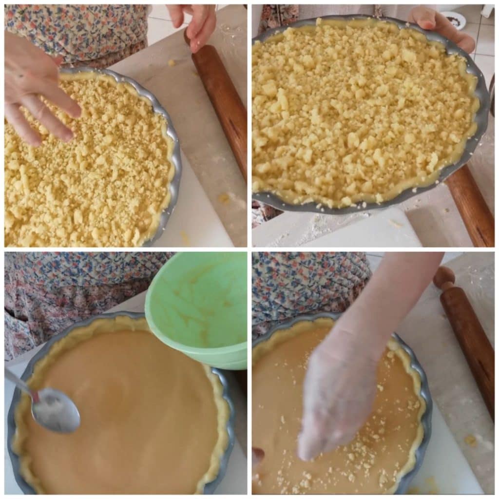 • Recuperamos a massa da geladeira, estendemos um pouco mais da metade em uma forma de bolo de 24 cm, untada com óleo e enfarinhada. A massa será muito quebradiça, irá se partir, ajeite com as mãos até cobrir toda a forma, fure o fundo com um garfo