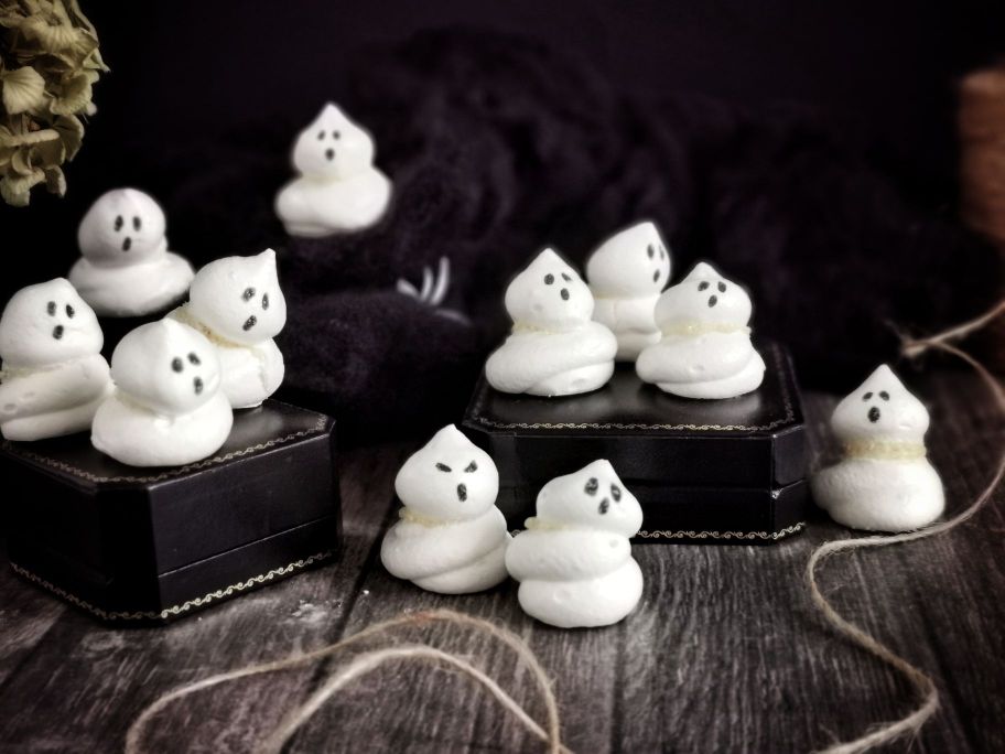 FANTASMINHAS DE MERENGUE, um docinho simples e assustador. Halloween é a festa da diversão e do medo, e o que é mais assustador do que um fantasma? Esses docinhos em forma de fantasma são fáceis de preparar e são perfeitos para a festa de Halloween. Tudo o que você precisa é modelar o merengue francês e finalizar as carinhas com um toque de chocolate amargo ou uma caneta comestível. É uma receita adequada para iniciantes e são realmente incríveis. Sou muito fã de merengue, e pensei nesses fantasminhas para servir como biscoitos, a única dificuldade é a preparação do merengue, mas se você seguir as instruções passo a passo, não terá dificuldades. Divirta-se!