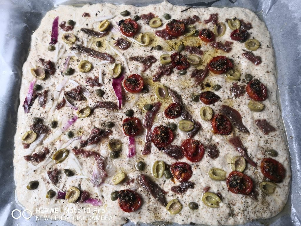 Em seguida, começamos a rechear a focaccia, eu coloquei alcaparras, azeitonas, anchovas em toda a superfície, finalizei uma metade colocando a cebola de Tropea finamente fatiada e a outra metade os tomatinhos confit, sal, pimenta e azeite de oliva extravirgem. Por fim, borrife um pouco de água na superfície.