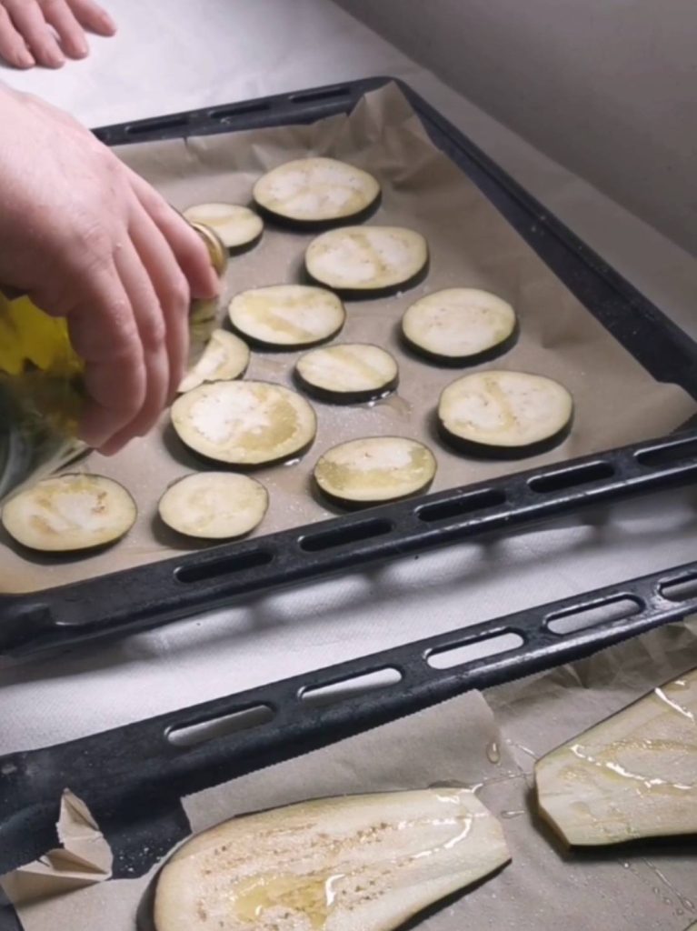 Corte as berinjelas em rodelas de cerca de 2 cm, coloque-as em uma assadeira forrada com papel manteiga, tempere com sal grosso e um pouco de azeite. Asse a 180° por 20 minutos