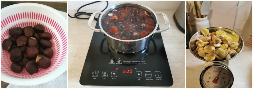 Começamos lavando as castanhas com água corrente, escorrendo-as e cortando um pedaço da casca com uma faca afiada. À medida que o faz, coloque-as em uma panela grande cheia de água, coloque a panela no fogo e cozinhe as castanhas por cerca de 30 minutos. Uma vez prontas, escorra e descasque, removendo também a película marrom, que está aderida ao fruto. Certifique-se de reservar apenas as boas, descartando as podres ou pretas. Depois, pese-as.