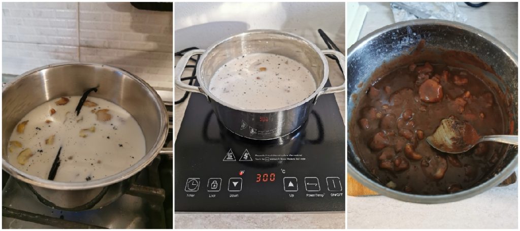 As minhas pesaram cerca de 270 g e adicionei 100 g de açúcar (adicione 20 g de açúcar a mais para cada 100 g de castanhas cozidas e descascadas). Coloque em fogo baixo, uma panela, coloque as castanhas, as sementes da vagem de baunilha e a vagem vazia (será removida no final), uma pitada de sal e o leite (mesmo peso das castanhas). Assim que começar a ferver, cubra com uma tampa, mexendo de vez em quando por cerca de 40 minutos. O tempo que o leite seja parcialmente absorvido pelas castanhas.