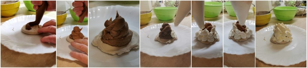 Pré-aqueça o forno a 100°. Preparamos o merengue francês. Uma vez pronto, colocamos o merengue em um saco de confeitar, e formamos 8 discos de merengue, de 8 cm de diâmetro, em uma assadeira forrada com papel manteiga. Assamos por cerca de 1 hora e meia, deixamos esfriar no forno com a porta entreaberta. Retire o merengue e disponha-os em 4 pratinhos.