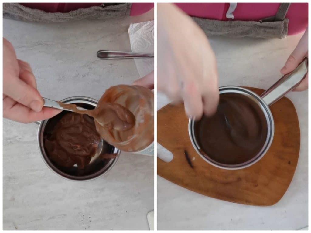 Começamos hidratando a gelatina em água fria, por pelo menos 10 minutos. Aqueça a creme de castanha em fogo baixo em uma panela pequena. Uma vez amolecida, escorra a gelatina e incorpore-a ao creme morno, mexendo para misturar tudo. Em seguida, despeje tudo em uma tigela e deixe esfriar