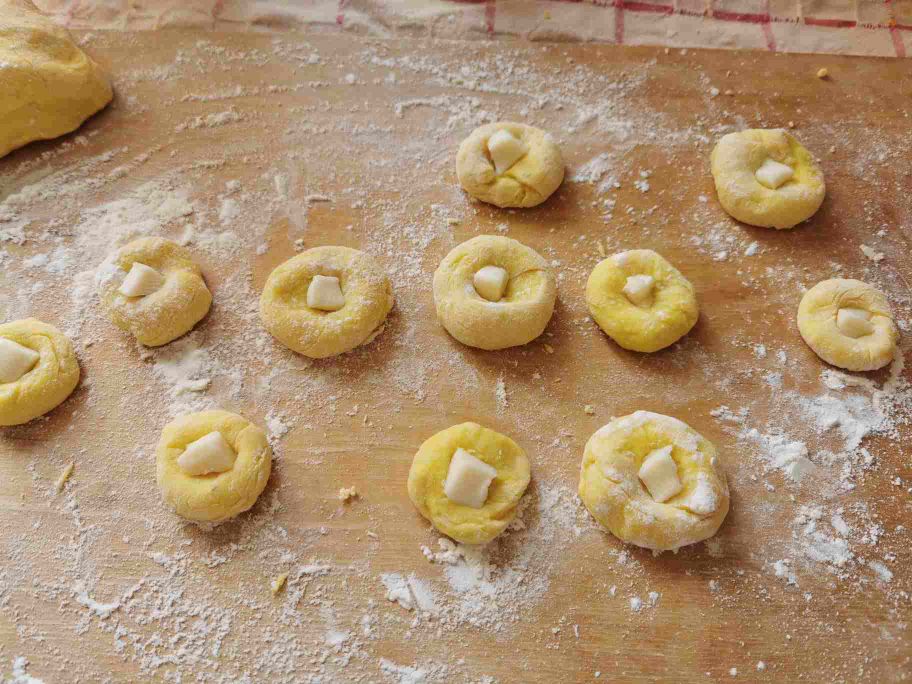 Uma vez frio, adicione a farinha, o ovo e o açafrão, adicione o sal e trabalhe até obter uma massa homogênea e elástica. Forme vários nhoques redondos, aproximadamente do tamanho de uma noz, faça um buraquinho no centro, criando uma cavidade para inserir o recheio e reserve