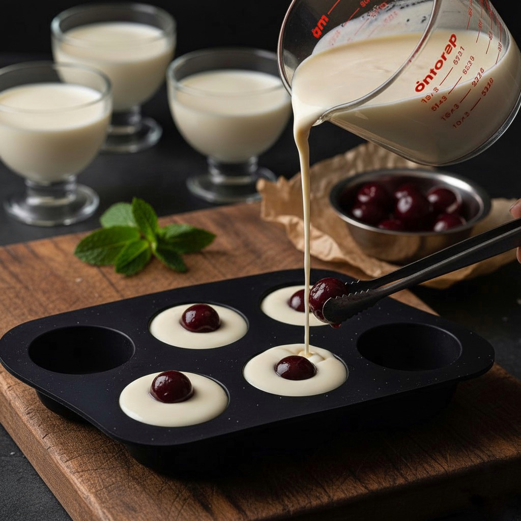 Crie os Olhos: Despeje parte da mistura de panna cotta nas formas de silicone em semiesfera (suas formas para os olhos). Coloque no centro de cada semiesfera uma amarena em calda (a pupila). Transfira imediatamente as formas para a geladeira e deixe endurecer por pelo menos 4 horas (melhor se for a noite toda).