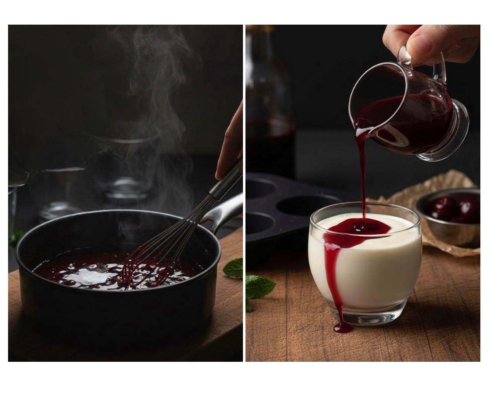 Despeje o Sangue: Na hora de servir, despeje algumas colheres deste xarope frio sobre a panna cotta já endurecida nas tacinhas, deixando escorrer também nas bordas para um efeito mais dramático.