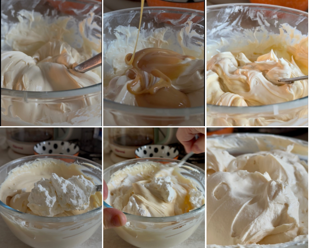 Incorpore o leite condensado ao mascarpone e misture até obter uma mistura homogênea e cremosa. Adicione o molho de caramelo à mistura e mexa delicadamente. Prove e, se desejar, adicione mais leite condensado para mais doçura ou mais caramelo para um sabor mais intenso. Incorpore delicadamente o creme de leite batido ao creme e misture de baixo para cima com uma espátula, para não desmanchar a mistura, o creme deve ficar firme e espumoso. Leve à geladeira.
