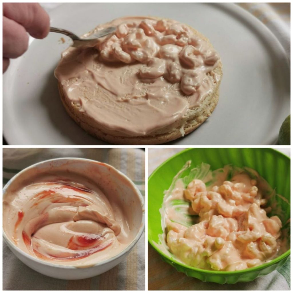 Molho rosa e camarões. Preparamos o molho rosa misturando a maionese e o ketchup, mas se quiser, pode usar também o já pronto. Juntamos os camarões ao molho, misturamos e espalhamos sobre a fatia