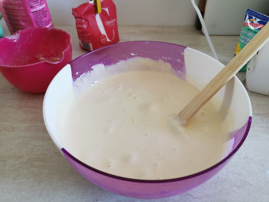 Começamos batendo com a batedeira elétrica na velocidade máxima, os ovos, junto com o açúcar, as raspas de limão, a pitada de sal e o extrato de baunilha, por pelo menos 15 minutos. A massa deve ficar clara, triplicada de volume e deve escorrer, se levantar a colher, como se fosse uma fita. Retire 2 colheres da massa e adicione à manteiga previamente derretida.