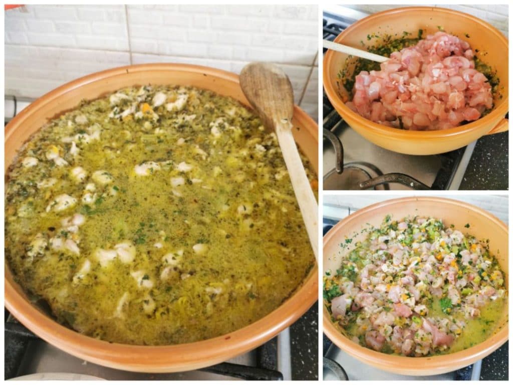 Cortamos finamente os vegetais, aipo, cenouras e cebola, e as ervas aromáticas, sálvia, alecrim. Pique também o dente de alho depois de remover o miolo. Pegue uma panela de barro, coloque duas colheres de azeite, os vegetais picados e deixe dourar por alguns minutos
