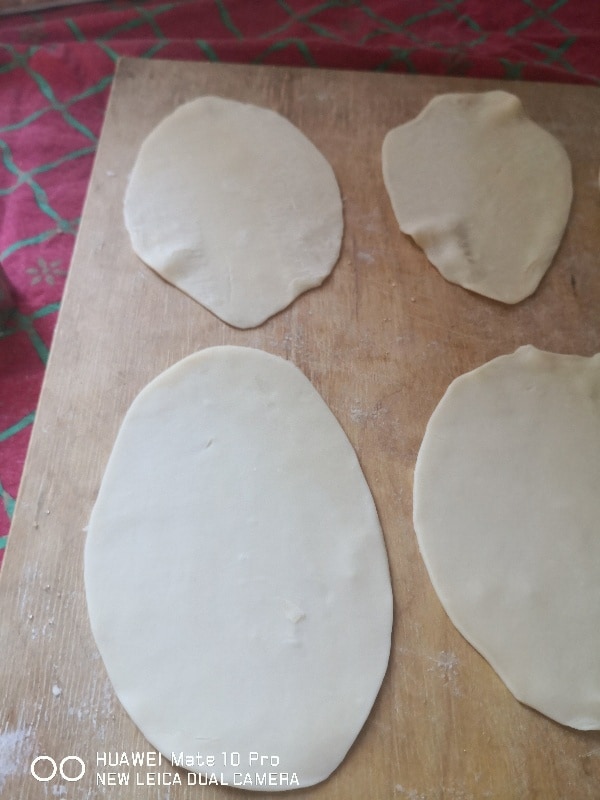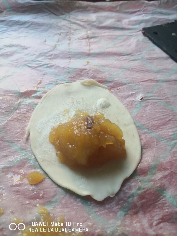 Corte na massa folhada cerca de 15 discos de aproximadamente 8 cm com o cortador de biscoito, depois estenda-os com o rolo de massa para alongá-los até obter uma forma oval. Coloque em cada oval a mistura de maçã e passas, umedeça as bordas com o ovo batido, dobre a massa e sele bem os bordos.