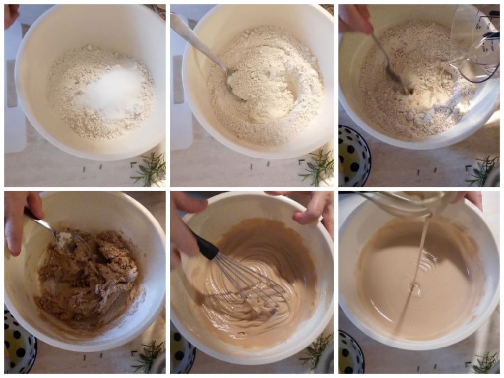 Em uma tigela, adicione a farinha de castanha, o sal e o açúcar. Adicione a água aos poucos, mexendo com um batedor manual. Misture bem, devemos obter uma mistura macia, fluida e sem grumos. Neste ponto, insira na massa metade da uva passa, bem escorrida, e metade dos pinhões. Misture bem.