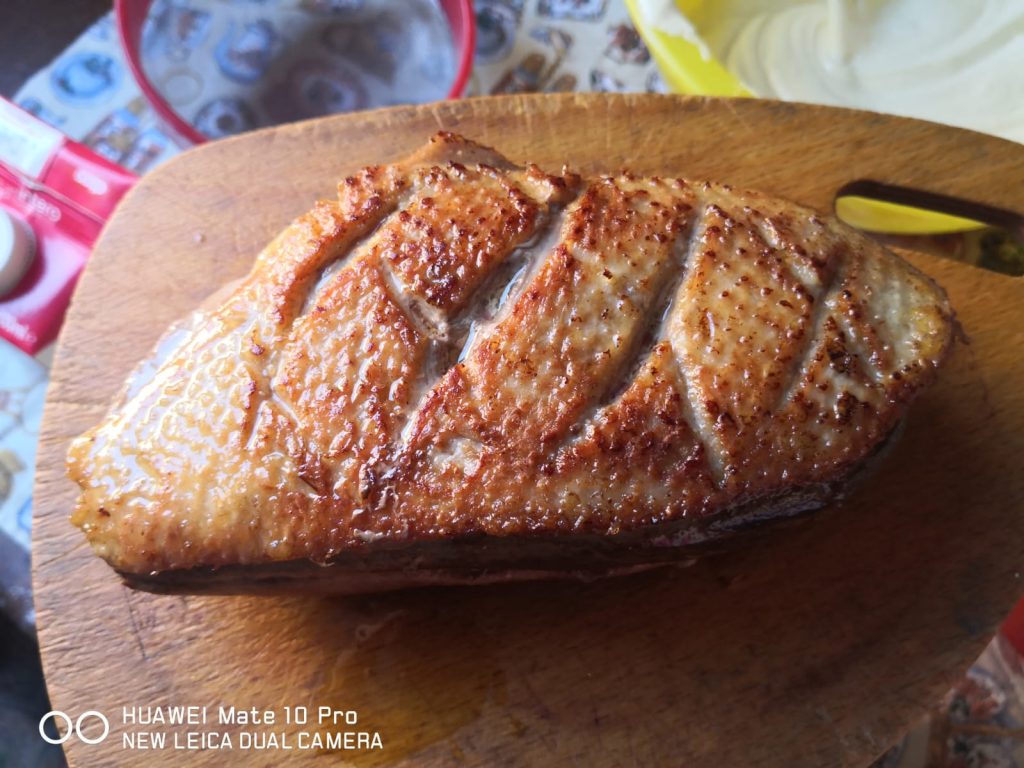 • Para cozinhar o peito de pato, utiliza-se pouquíssimo tempero, pois a camada de gordura que você encontra em um lado do peito irá derreter e será usada para cozinhar tudo. Primeiro, coloque o peito em uma tábua de corte e, pressionando de lado, com uma faca bem afiada, faça cortes oblíquos distantes cerca de 1 cm entre eles. Lembre-se de cortar apenas a gordura sem chegar à carne.
