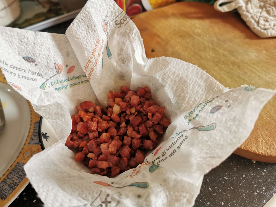 Enquanto isso, crocamos o speck, cortado em cubos. Fritamos em uma caçarola com pouco óleo por alguns minutos. Cobrimos e deixamos de lado.