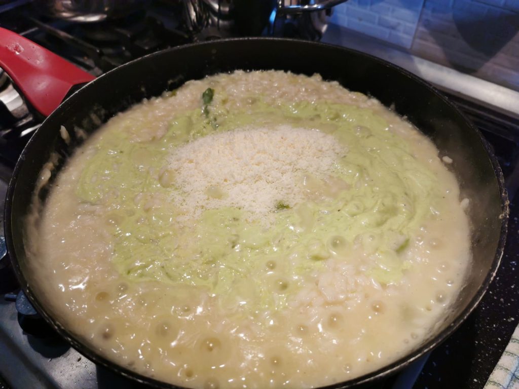 Cerca de 7 minutos antes de o arroz estar cozido, adicione o creme de aspargos, mexa e continue a cozinhar em fogo baixo, adicionando o caldo se necessário. Importante: apenas quando o risoto estiver pronto, ou seja, o arroz estiver cozido al dente e tiver atingido a cremosidade certa, não muito líquido, não muito seco, adicione as pontas dos aspargos, mexa bem e deixe cozinhar por alguns segundos. Desligue o fogo e adicione o grana, mexa bem com o fogo desligado, adicione um pedaço de manteiga, misture e ajuste o sal e a pimenta. Aqui está seu Risoto com aspargos está pronto, sirva bem quente.