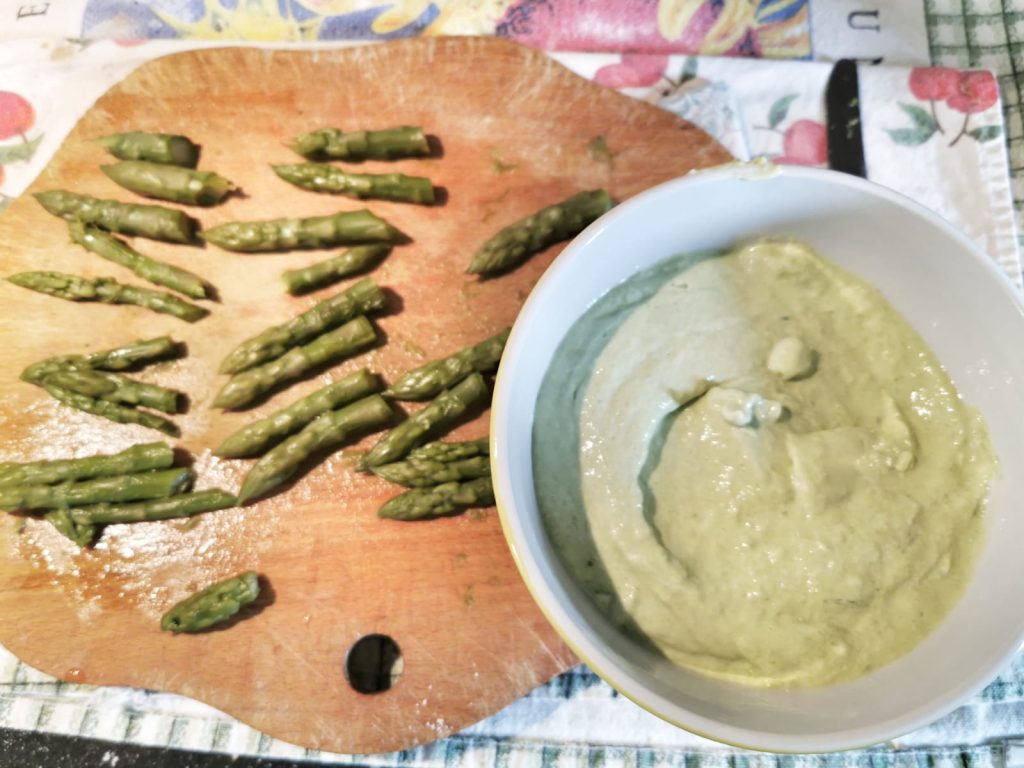 Uma vez prontos, corte os talos, obtendo pedaços de aspargo de 6-7 cm, reserve e bata o restante dos talos com a ajuda de um mixer, adicione 2 colheres de água e o queijo cremoso, bata até obter um creme homogêneo. Neste ponto, você terá o creme de aspargos, as pontas de aspargos e os pedaços de aspargos, coloque tudo de lado.