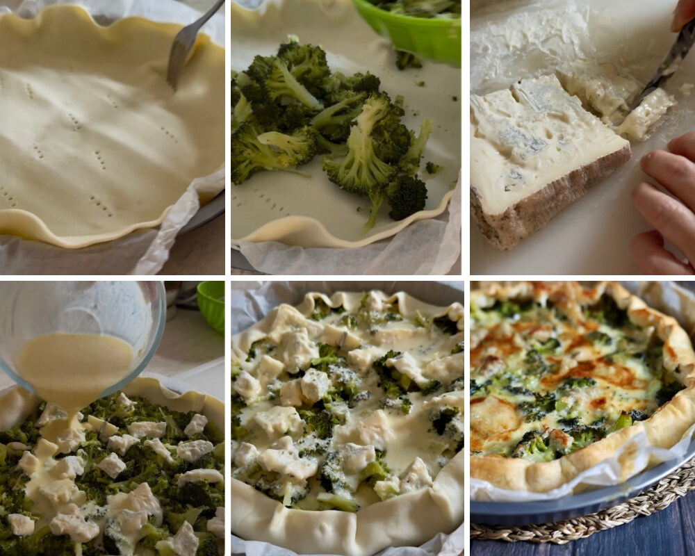 Estenda a massa folhada e coloque-a em uma forma de torta. Adicione os brócolis cozidos, o gorgonzola em pedaços e despeje o creme de ovos, leite e parmesão. Asse a torta salgada a 180°C por cerca de 30 minutos, ou até que a massa folhada esteja dourada.