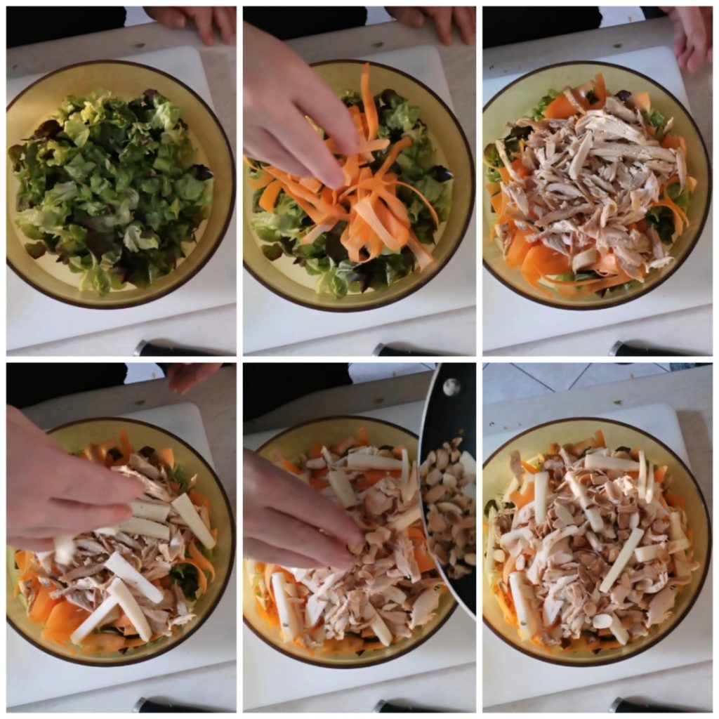 Salada de frango assado com amêndoas e cenouras, receita saudável, e deliciosa.