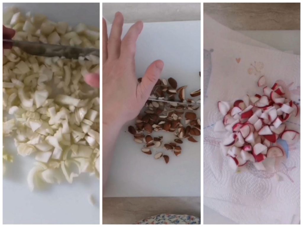 • Lave e limpe os funchos, corte-os em cubinhos. Quebre as amêndoas e toste-as no forno por alguns minutos ou você pode usar as já prontas. Lave a maçã e corte-a em pedaços como o funcho, deixe a casca