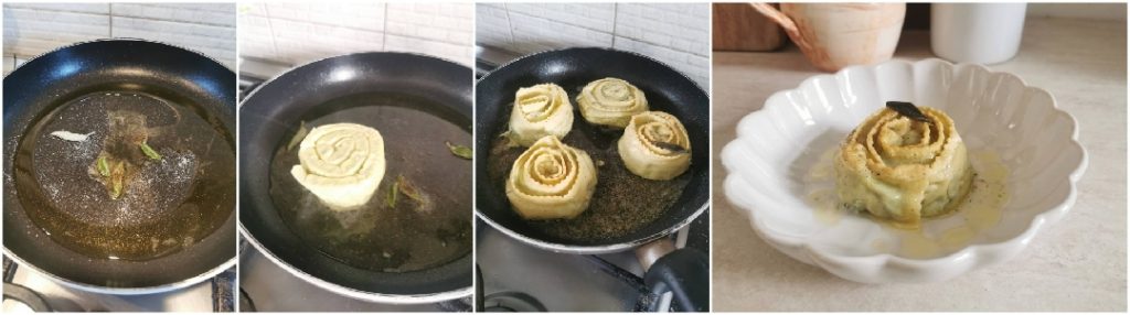 Cozimento. Disponha as rodelas de massa em uma assadeira, onde na base você colocou para derreter um pouco de manteiga. Adicione a sálvia, sal e pimenta, deixe cozinhar por poucos minutos e finalize com uma pitada de parmesão ralado. Coloque a tagliatella em um prato, decore com algumas folhinhas de sálvia e uma colher de manteiga derretida, sirva.