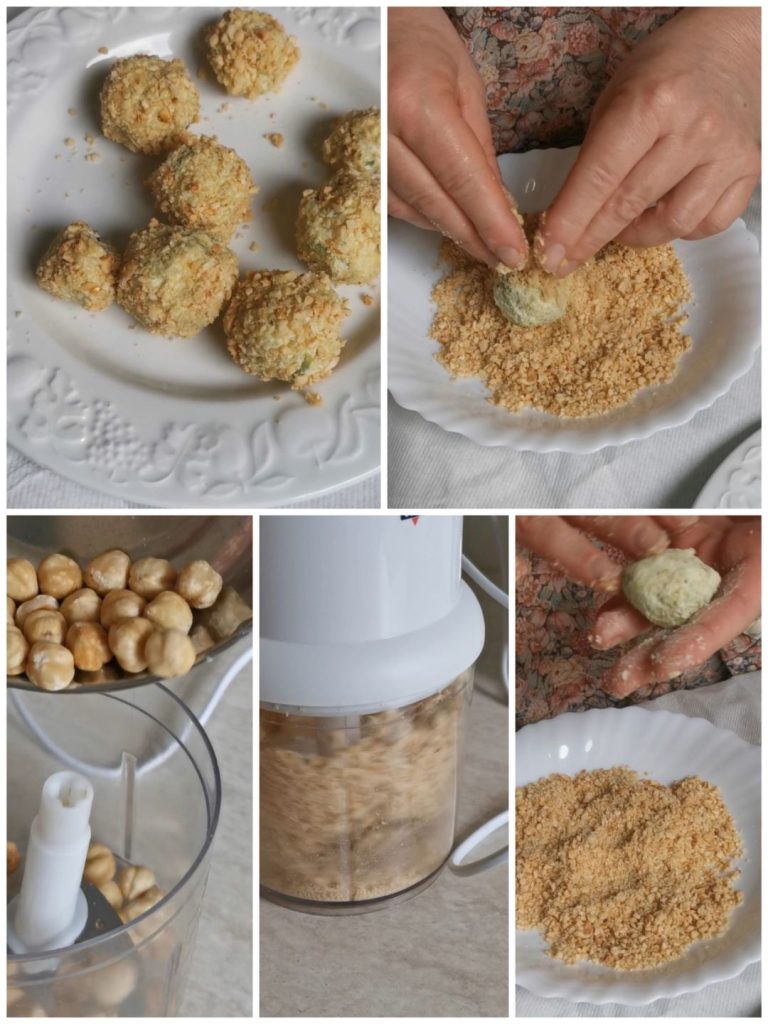 Quando a massa estiver pronta, com as mãos úmidas, faça bolinhas do tamanho de nozes. Em seguida, passe-as no granulado de avelã, eu preparei com as avelãs que tinha em casa, ou você pode comprá-lo já pronto (para comprá-lo clique aqui)