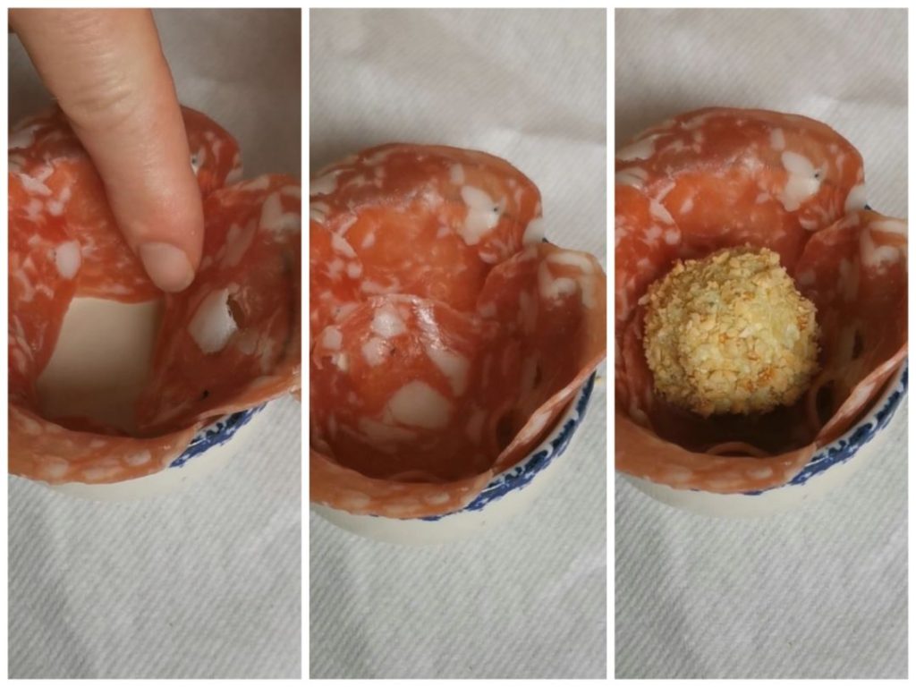 Providencie pequenas tigelas ou copinhos, coloque em cada um as fatias de salame, de forma a cobri-los, deve parecer uma flor, e no centro coloque o tartufino. Para comer frio de uma vez só…