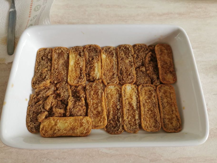 Primeiramente, embeba os biscoitos champanhe no café frio, que você colocou em uma tigela. Arrume uma primeira camada de biscoitos champanhe no fundo de uma travessa, quando necessário, corte os biscoitos com uma faca para não criar espaços.