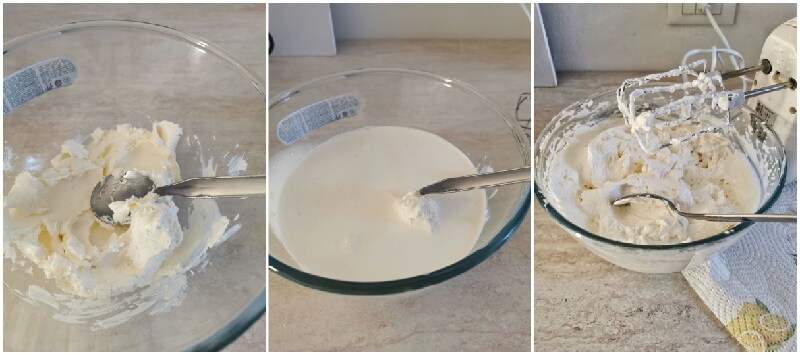 Creme de chantilly e mascarpone. Preparamos o creme para rechear o bolo. Em uma tigela colocamos o mascarpone, mexemos com uma colher para amolecer, adicionamos o creme de leite e batemos tudo com uma batedeira elétrica. No meio do preparo adicionamos o açúcar de confeiteiro, batemos até obter um creme com consistência firme. Lavamos as frutas e secamos bem