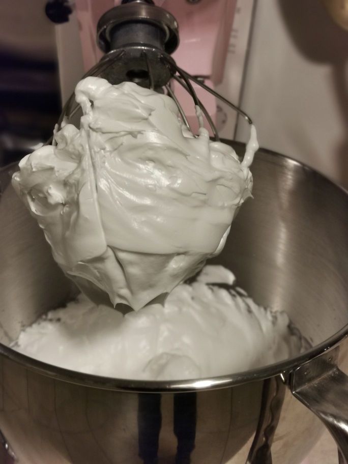 Vire o papel, e preencha os círculos que desenhamos com o merengue preparado. Colocamos a mistura em um saco de confeitar com um bico liso e grande de cerca de 1,5 cm, e começando do centro do círculo, traçamos listras até cobrir completamente. Fazemos 2 camadas de merengue por volta, a base deve ter pelo menos 2 cm de espessura. Alise a superfície com uma espátula, proceda assim para todos os círculos. Colocamos no forno estático a 100º por 20 minutos, depois abaixamos para 90º por cerca de 1h e 15 minutos. Em seguida, insira na porta do forno uma colher de pau de modo a deixar uma fenda, e cozinhe por mais uma hora. Depois desligue. Se você tiver um desidratador pode usá-lo, ajuste para 60º por 10 horas