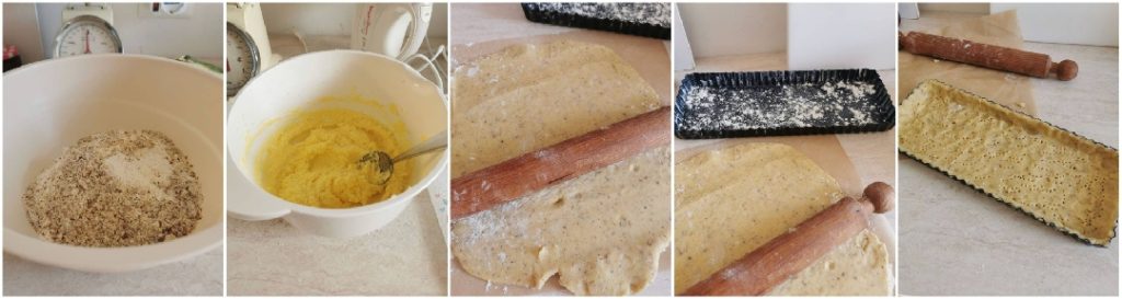 Preparamos a massa quebrada, batemos a manteiga com o açúcar, sal e baunilha até obter um creme espumoso e claro. Adicionamos os ovos um a um, sempre batendo com a batedeira elétrica, até obter um creme. Acrescente a farinha de trigo 00 e a farinha de amêndoas, peneiradas com o fermento e as raspas de limão. Amasse com as mãos, se não tiver uma batedeira, até compactar tudo. Envolva a massa em filme plástico e deixe descansar na geladeira por pelo menos 30 minutos. Quando a massa quebrada estiver pronta, abra com um rolo de massa enfarinhado até uma espessura de 4 mm.