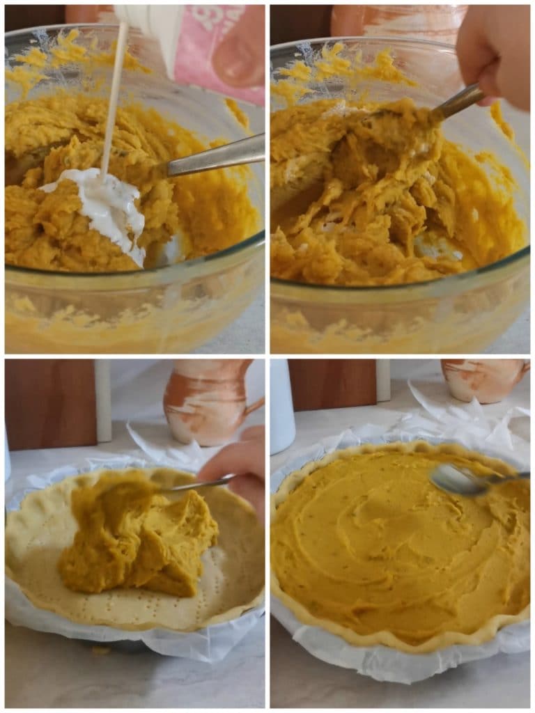 O coração da nossa torta será um cremoso creme de abóbora. Para prepará-lo, basta assar a abóbora no forno, passá-la na peneira e misturá-la com ovos, açúcar, creme de leite e especiarias como canela e noz-moscada.