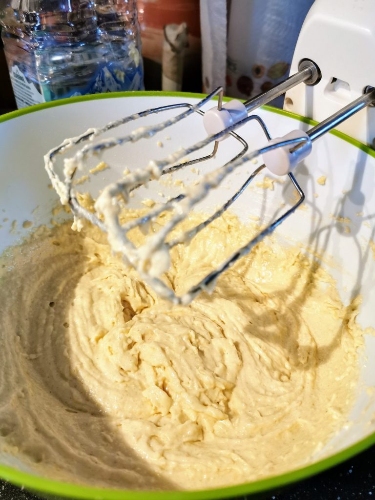 Bata a manteiga amolecida e o açúcar com o batedor elétrico. Uma vez obtida uma mistura fofa, adicione os ovos um de cada vez, misture. Adicione as farinhas mexendo de baixo para cima, até obter um creme homogêneo.