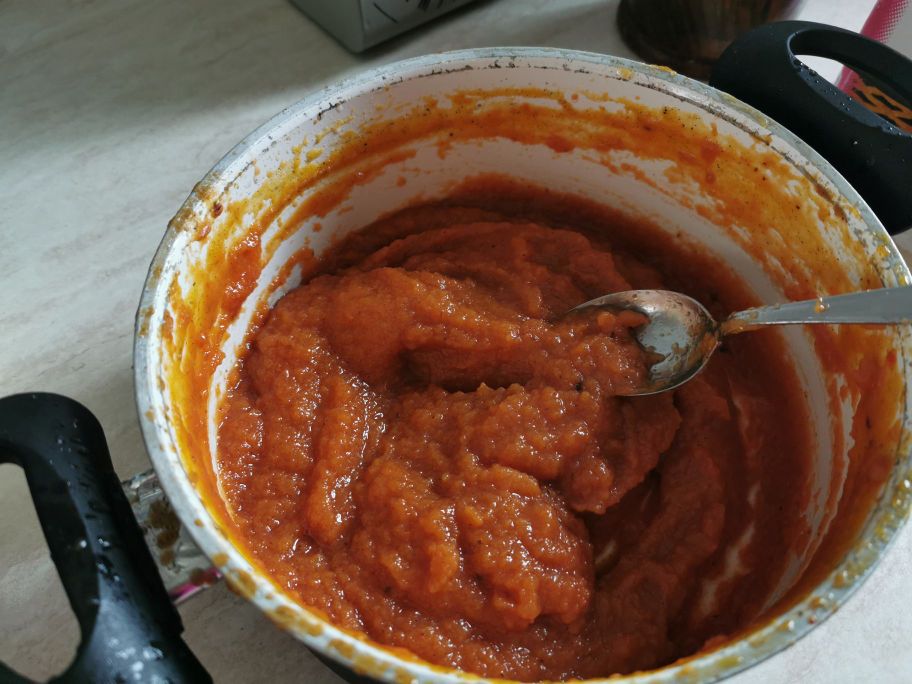 Bata a mistura com um mixer de mão, adicione o açúcar e misture bem, mexendo. Continue cozinhando em fogo baixo, sempre mexendo, até atingir a consistência desejada. Desligue o fogo, mexa e coloque a geleia em um pote
