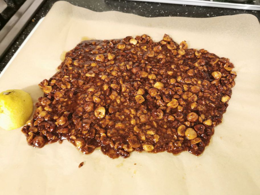 Retire do forno e deixe esfriar. Transfira o bolo para um prato de servir e decore com o crocante em pedaços, fantástico