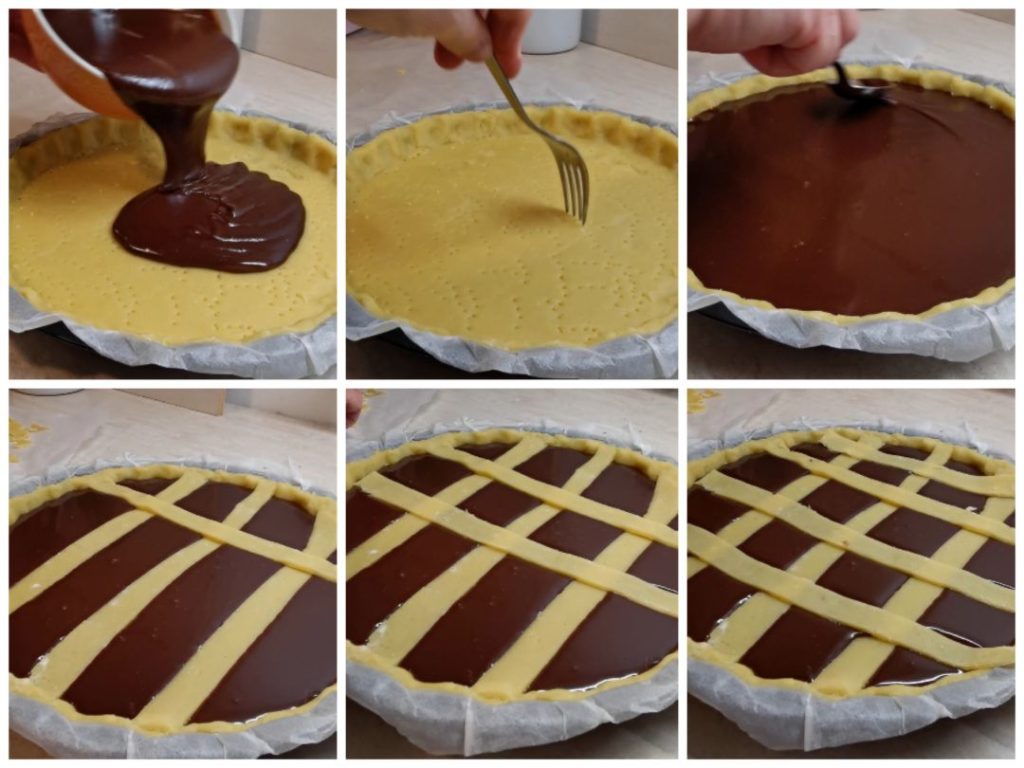 Montamos o bolo. Comece estendendo a massa frola com o rolo enfarinhado, sobre o papel manteiga, numa espessura de 4 mm. Coloque o papel manteiga com a massa em uma forma de torta, pressione bem as bordas na forma, e retire com uma faca o excesso de massa. Coloque a massa restante na geladeira. Fure a base da torta com os dentes de um garfo. Pegue o creme, misture, despeje na base de massa, deixando cerca de 7 mm da borda, distribua bem o chocolate na superfície. Pegue a massa restante, estenda e corte 6/7 tiras de cerca de 1 cm, usaremos para decorar o bolo. Retire o excesso de massa. coloque o bolo na geladeira por cerca de 15 minutos.